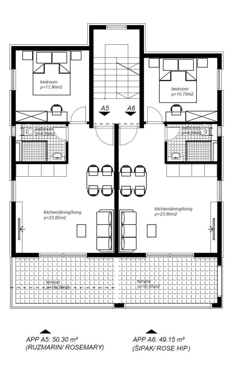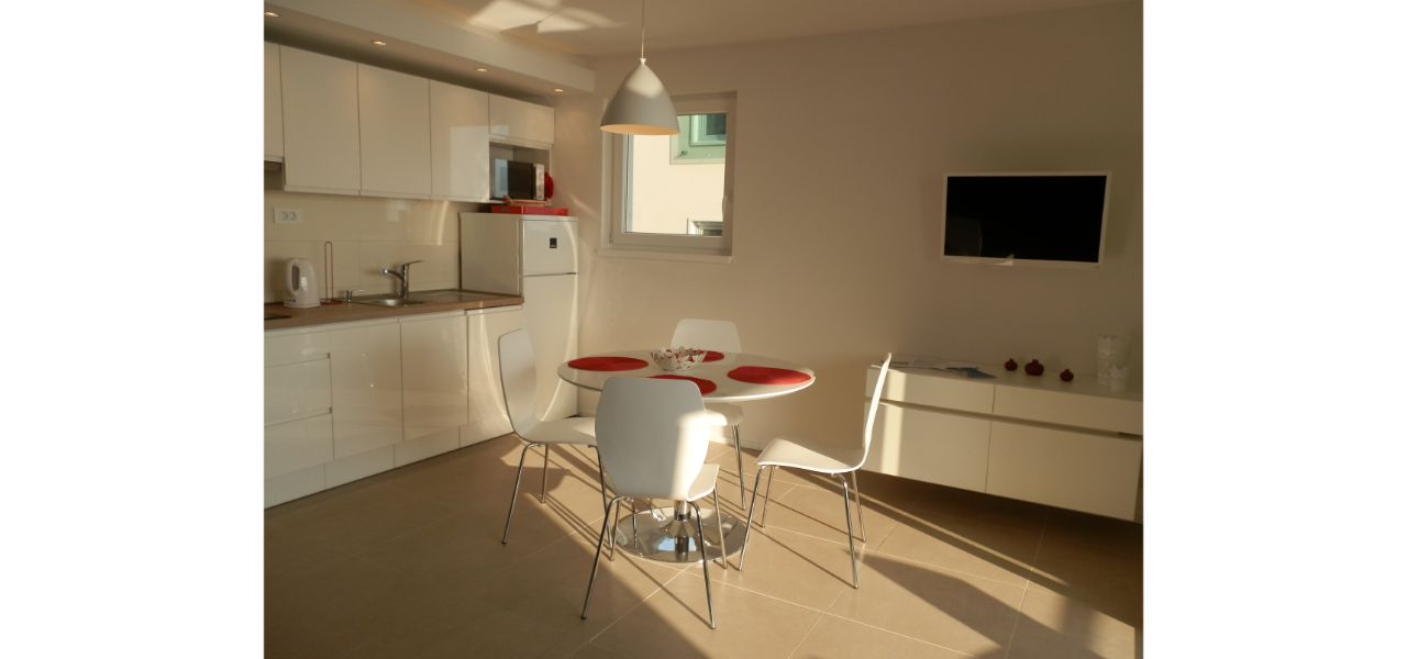 In “Šipak” you are located on the 2nd floor, above the pines, with nothing between you and the sea. “Šipak” has one bedroom, bathroom, living room, kitchen and beautiful terrace. The living room has a sea view and modern, comfortable couch for two persons. Kitchen is fully equipped for cooking, and also has a table for dining.
