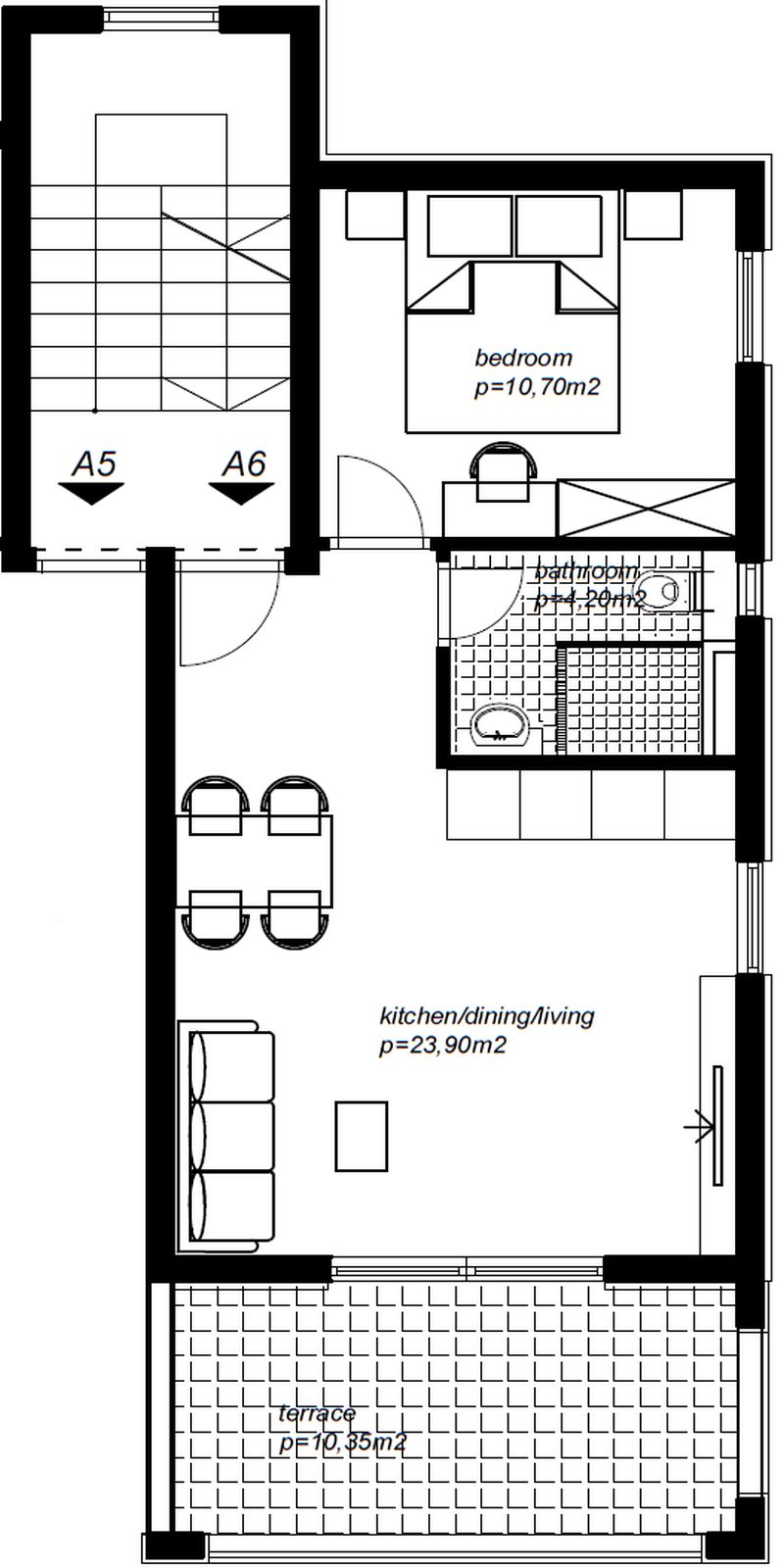 If you prefer terrace, you have table with comfortable chairs to enjoy the meal, coffee or just a view. Bedroom has a comfortable double bed, wardrobe, table and chair. Whole apartment has 49,15 m2.